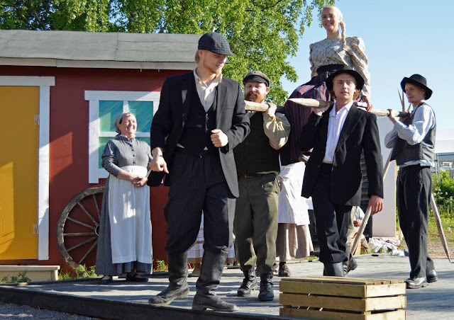 Täytyy myöntää, että kyllä soi loppupäivän päässä Myrskyluodon Maijan tunnussävelmä, joka kajahti ilmoille heti esityksen alkuhetkillä. Niin hienosti ja komeasti kaikuivat tutut sävelet! Noiden sointujen lisäksi en sitten tiennytkään Maijan tarinasta mitään, joten odotin innolla että mitäs kaikkea tapahtuu ja ketäs kaikkia nämä tyypit täällä lavalla ovat? Mieleen jäivät erityisesti Maijan veli Jan (Sami Paasila) ja se silakka-kohtaus, kuolemaa ennustava Marras (Mikko Paloniemi), Vallborg (Marjut Toivanen) ja suutari Pelle (loistava Antti Timonen), joka hurmasi Myrskyluodon lasten lisäksi luultavasti koko katsomon.